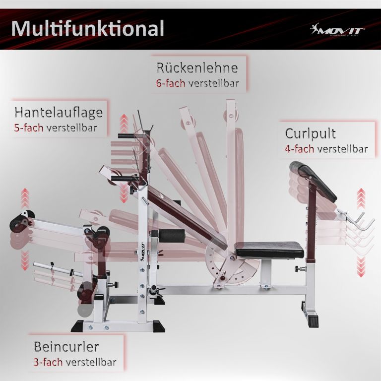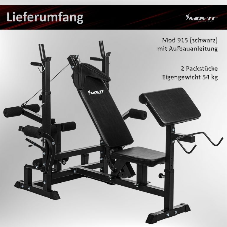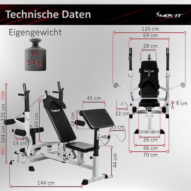 Kombinovaná dlouhá a šikmá lavice, vícenásobně nastavitelné opěradlo a stojan na činky, integrovaný modul kabelové kladky, dvě rukojeti pro ponoření, dva stojany na zadní straně pro vybavení, pogumované stabilní nožičky. Dlouhý stojan na činky (až 180 kg), motýlí ramena (každé až 40 kg), snadno vyměnitelný stojan na kotouly a kleště na nohy (až 60 kg).