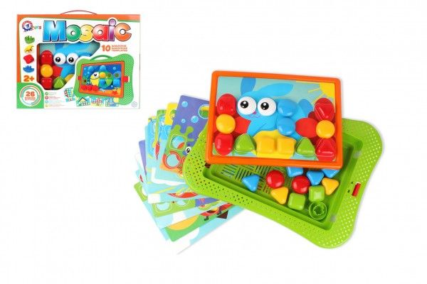 Mozaika pro nejmenší, velikost kolíčku 35 mm a 10 barevných šablon (předloha k umisťování kolíčků). Obsahuje 26 barevných kloboučků, které se skládají na podkladovou desku s předtišněným motivem mají různé tvary, dokážou vytvořit nádherné obrázky. Díky velkým dírám a kolíčkům nebudou mít ani ti nejmenší problém s umisťováním. Mozaika zábavnou formou rozvíjí logické myšlení, rozvíjí manuální dovednosti a představivost, učí základní barvy, cvičí koncentraci. Je skvělým příkladem toho, jak snadno se děti učí formou hry. Vhodné pro děti od 2 let.