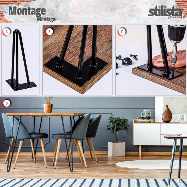 Stolové nohy řady Stilista přesvědčí svým jednoduchým a nadčasovým designem. Můžete si tak svůj nábytek navrhnout kreativně a individuálně. Nohy sou vyrobeny z 12 mm kruhové oceli a navíc mají pevnou základovou desku. Mírný sklon nohou poskytuje dodatečnou stabilitu.