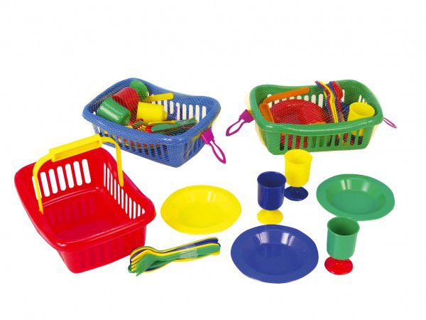 Barevná plastová sada nádobí v košíku, která postačí pro jakoukoliv hostinu. Balení obsahuje košík, ve kterém se nachází 3 talířky, 3 hrníčky, 3 podšálky a 3 sady příborů (lžička, vidlička, nůž).Vhodné od 3 let.