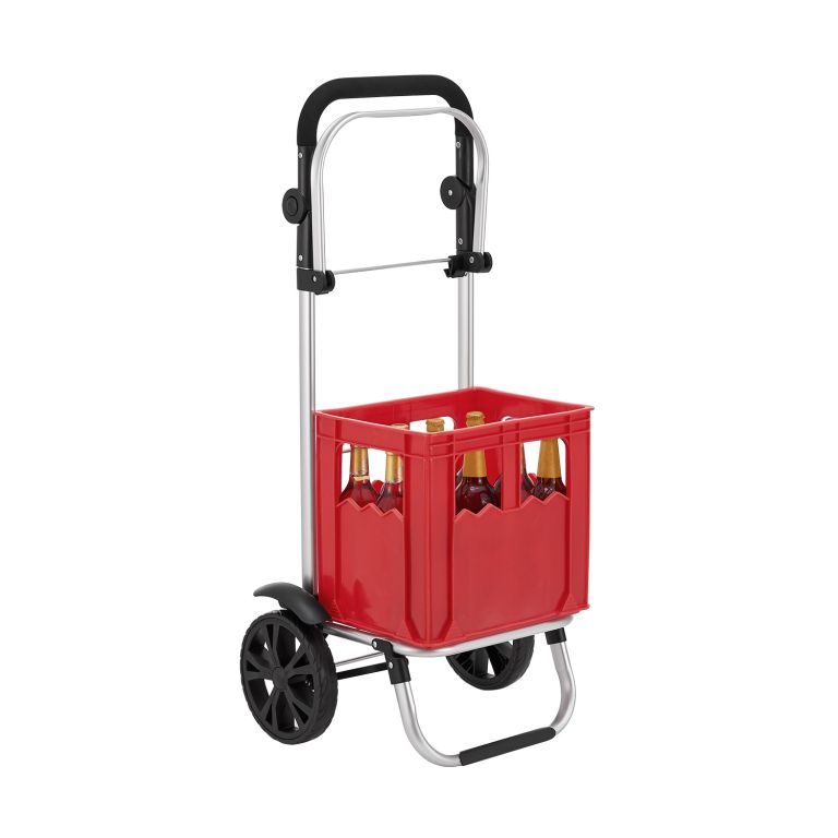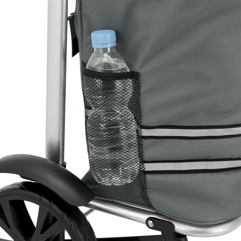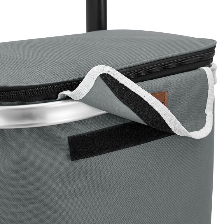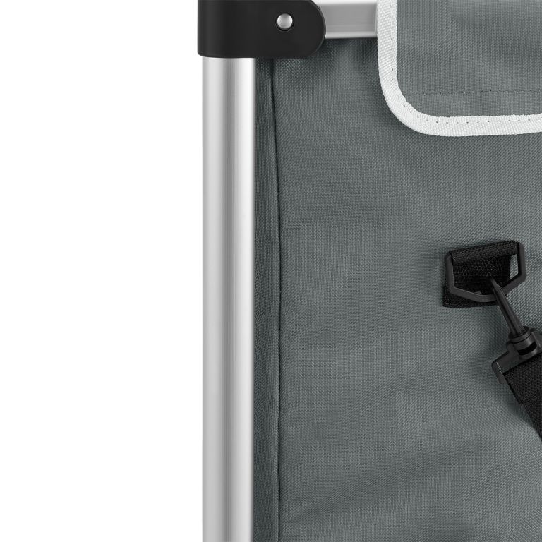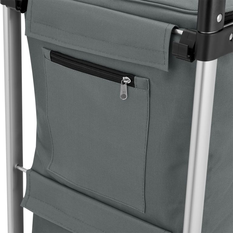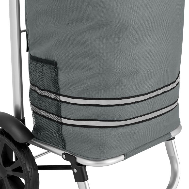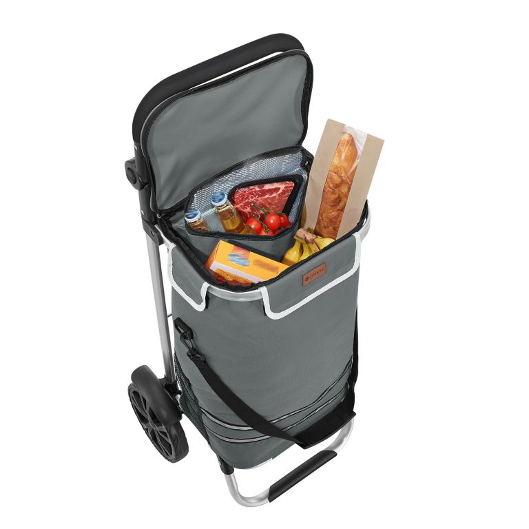 Zobrazit podrobnější popisPraktický šedý nákupní vozík na dvou kolech pro pohodlné nakupování bez námahy.