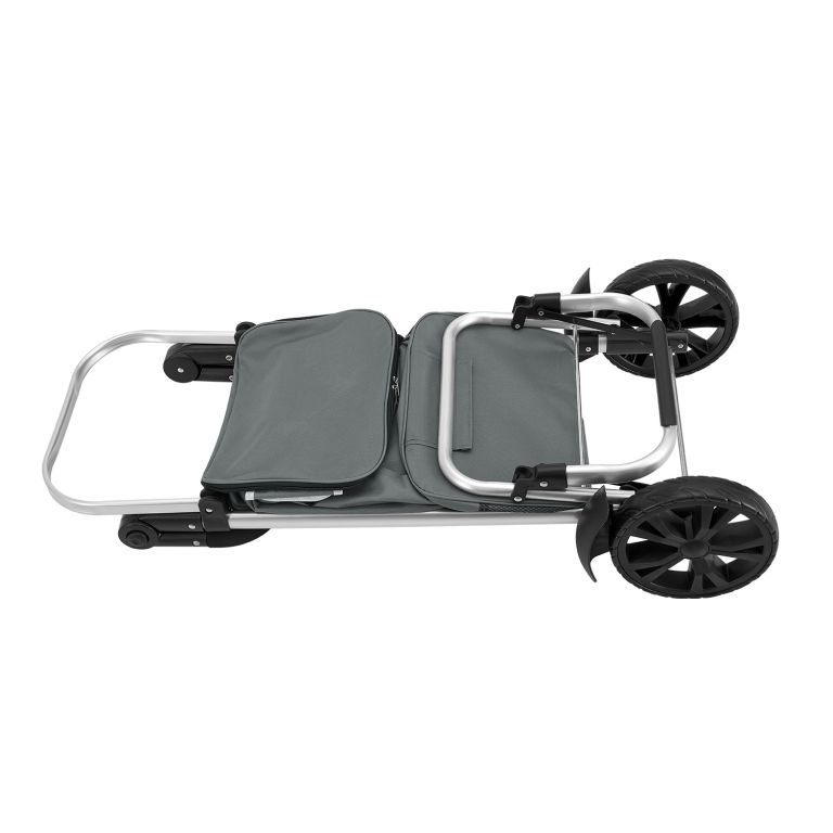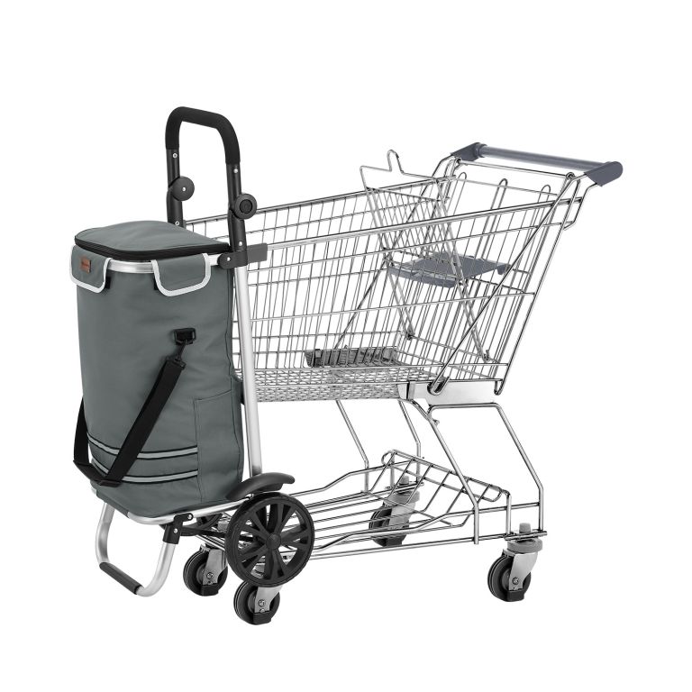 Praktický šedý nákupní vozík na dvou kolech pro pohodlné nakupování bez námahy.