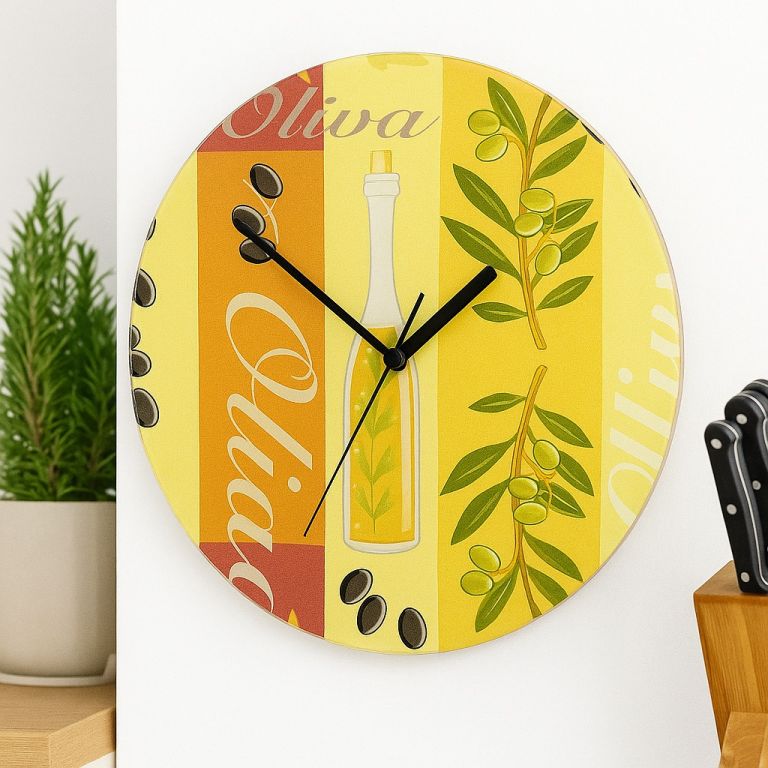 Propojte eleganci a praktičnost s těmito skleněnými hodinami, které okouzlí každého milovníka středomořského stylu. Jemné barvy a motiv oliv navodí příjemnou atmosféru a dodají vašemu interiéru jedinečný šmrnc.