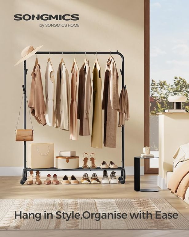 Robustní ocelová konstrukce, boční háčky na doplňky a spodní police pro boty nebo krabice dělají z tohoto stojanu nepostradatelný doplněk domácnosti. Je ideální pro muže, kteří hledají kombinaci odolnosti, funkčnosti a jednoduchého designu. Sestavení zvládnete během několika minut díky přehlednému návodu a označeným dílům.