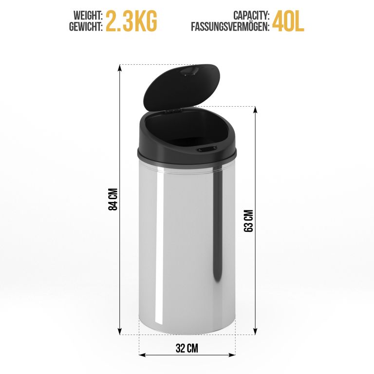 Moderní bezdotykový koš se senzorem, objem 40 l, elegantní stříbrný design.