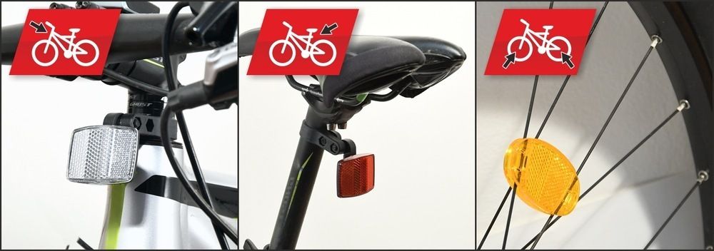 Standardní uchycení jednotlivých prvků usnadňuje jejich umístění. Přední a zadní odrazka lze pomocí šroubováku nastavit do požadovaného úhlu. Přední odrazka je vhodná pro trubku o max. průměru 22,2 mm, zadní odrazka je vhodná na trubku o průměru max. 27,2 mm. Oranžové odrazky se pouze nasadí a nasunutím se „zaseknou“ drážkami do výpletu kol.