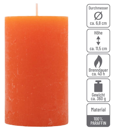 Každá svíčka má průměr 6,8 cm a výšku 11,5 cm, vyrobena je ze 100 % parafínu a poskytuje rovnoměrné hoření až 40 hodin. Rustikální provedení je odolné a stabilní, bez parfemace, snadno se zapaluje a lze ho bezpečně používat v žáruvzdorných svícnech. Perfektní sada pro dlouhodobé i opakované použití.