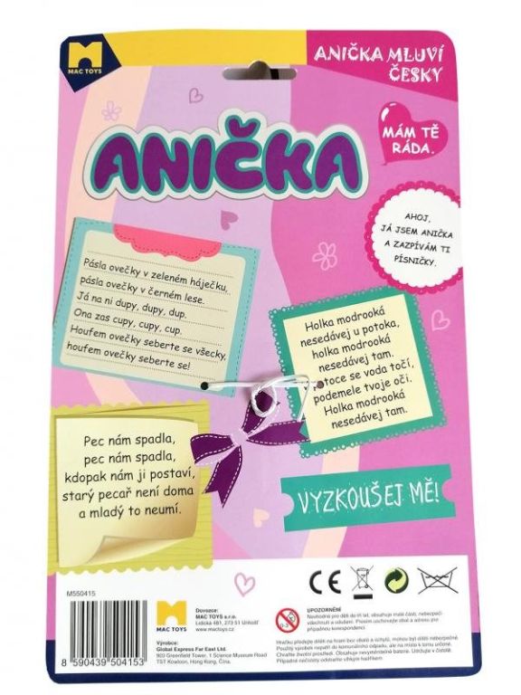 Vymyslí si pro ni příběhy, přitulí se a vyzkouší, jaké písničky a básničky Anička umí přednášet. Váš potomek může zpívat s panenkou nebo se díky ní naučí písně, které doteď neznal. Přidejte se k němu a společně si zazpívejte Pásla ovečky, Pec nám spadla nebo Holka modrooká. Poznámka: Varianty jsou dodávány náhodně.