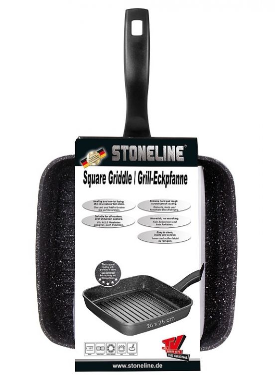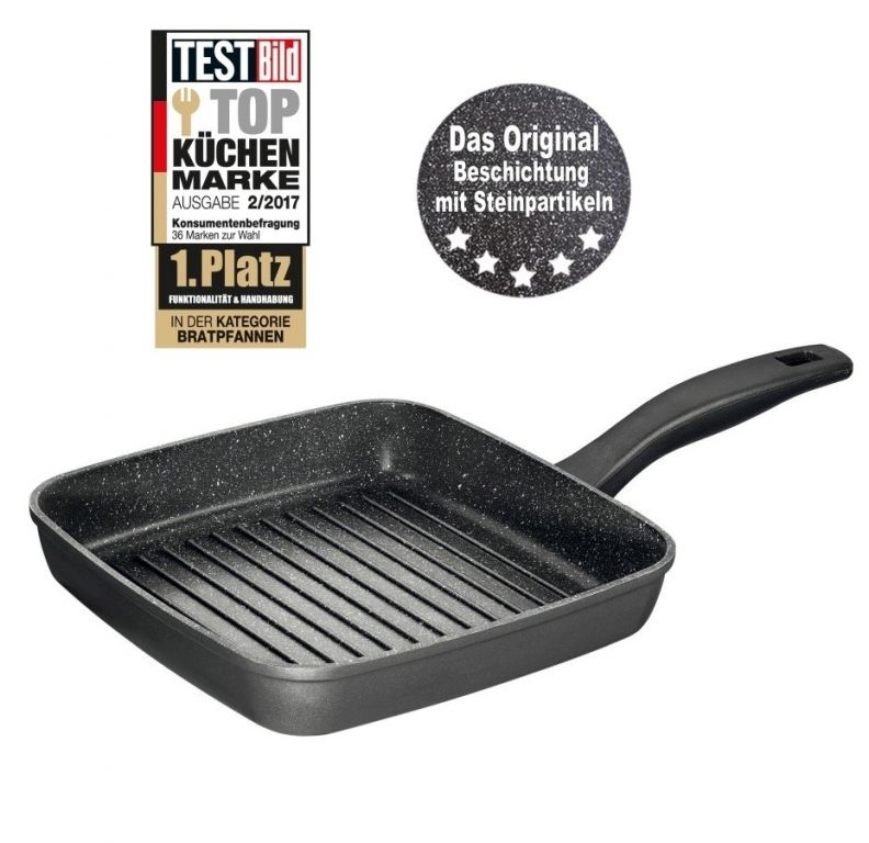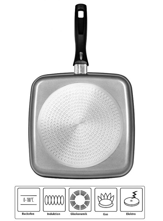 Grilovací pánev je vyrobená z hliníku a má nepřilnavý povrch s pravými částicemi Alpského kamene. Budete tak vařit, smažit a grilovat jako na pravém přírodním kameni. Korpus s tloušťkou stěny 4,5 mm je odolný vůči poškrábání. Vhodná do myčky na nádobí. Ergonomická rukojeť s měkčenou protiskluzovou úpravou zůstává chladná po celou dobu vaření. Vhodná i do trouby do maximálně 180 °C.