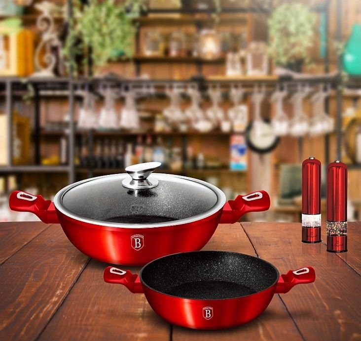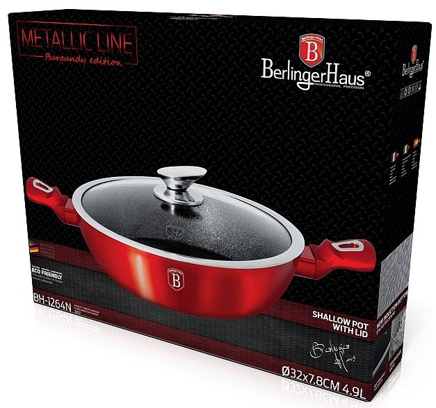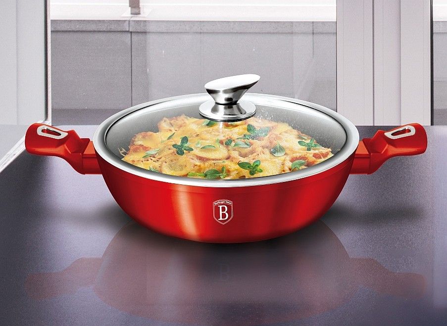 Krásný pekáč Berlingerhaus BH-1264 kolekce Burgundy Metallic Line v elegantní červené barvě s dostačujícím průměrem 32 cm vám uspoří až 35 % energie. Poteší vás jeho krásný design metalické barvy.Pekáč má 3vrstvý nepřilnavý mramorový povrch a je vyrobený z kovaného hliníku. Pekáč BH-1264 je osazený Turbo indukčním dnem a ergonomicky měkčenou rukojetí. Vhodný na všechny druhy ohřevu, včetně indukce a do myčky nádobí. Poklice je vyrobená z termo skla s nerezovými úchopy.