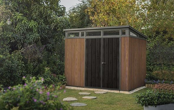 Bezúdržbový domek PENT 9 x 7 je vyroben z jedinečného materiálu DECOCOAT, který je inspirován moderním vzhledem v imitaci dřeva