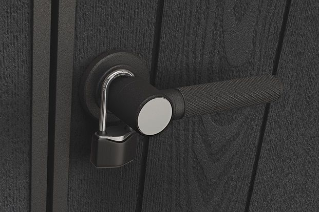 Je také vybaven pevnou designovou střechou, širokými dvojitými dveřmi a podlahou pro náročné použití s nosností 150 kg na m².