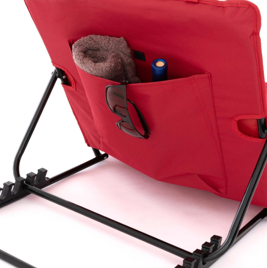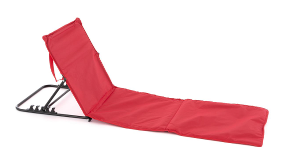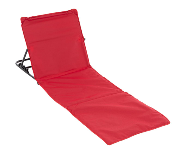 Užívejte si pohodlí na pláži i na zahradě — červená polstrovaná podložka s nastavitelným opěradlem je skládací, lehká a praktická.