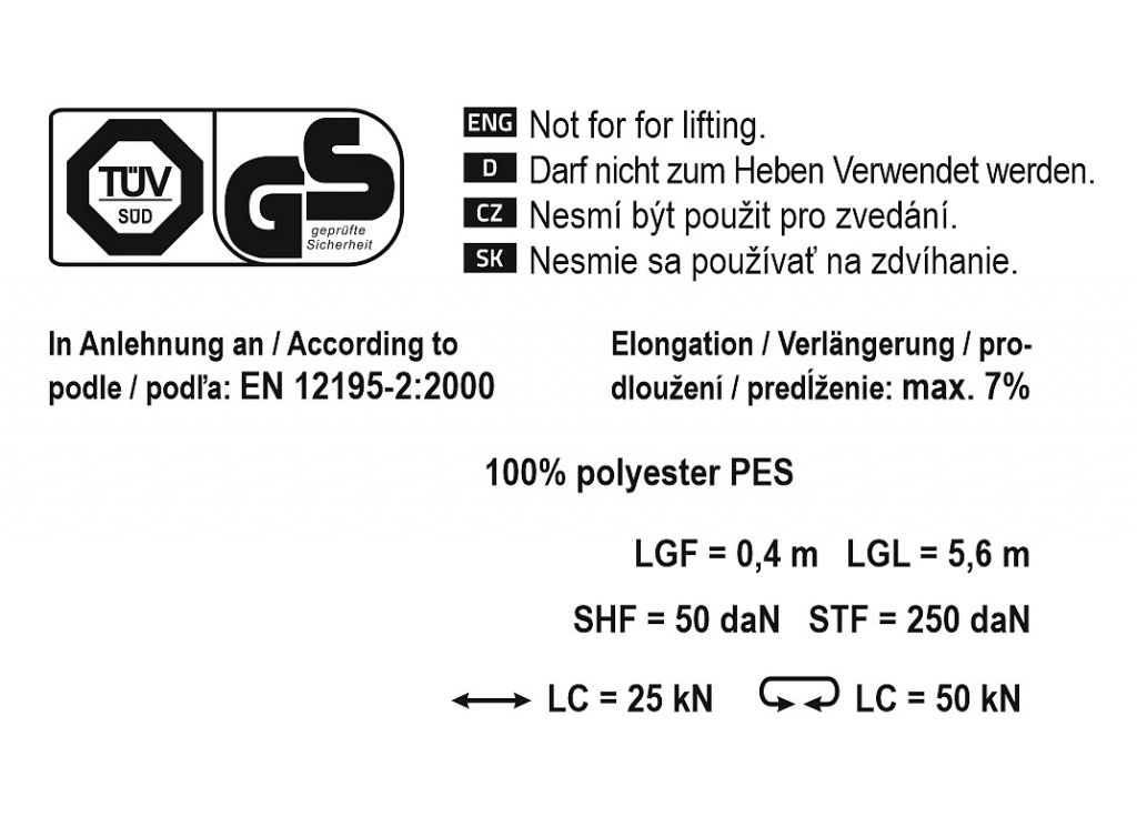 Ráčna je celokovového provedení s odolným jistícím mechanismem, opatřeným plastovým madlem pro pohodlnou manipulaci a ovládání. Popruh šíře 50 mm s délkou 6 m se vyznačuje pevností v tahu 5000 kg (po obepnutí nákladu). Při upínání nákladu doporučujeme používat plastové rohy nebo ochranné návleky. Bez použití ochranných návleků, nebo rohů, dochází ke snížení pevnosti upínacích pásů a k opotřebení popruhu. Upínací pásy není povinné evidovat, nemusí se provádět revize, ale doporučujeme je minimálně 1x ročně prohlídnout řádně proškolenou a přezkoušenou osobou.