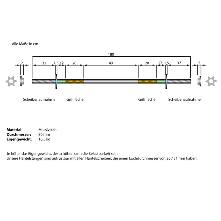 Robustní konstrukce zajišťuje bezpečnost a dlouhou životnost. Osa má průměr 30 mm a délku 180 cm, což umožňuje široké spektrum cviků. Dva hvězdicové uzávěry drží závaží pevně na místě. Maximální nosnost 150 kg je vhodná pro většinu domácích i pokročilých tréninků.