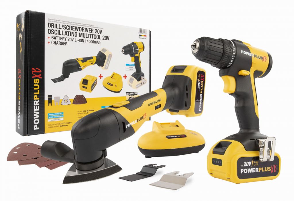 POWERPLUS Sada Aku vrtačka, multifunkční bruska, 20 V, 4 Ah