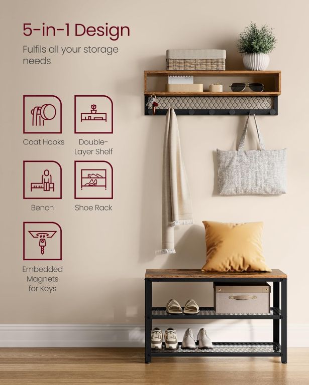 Díky lavici s nosností až 136 kg si můžete pohodlně sednout při obouvání, zatímco 7 kovových háčků a dvoupatrový botník zajistí prostor pro kabáty, tašky i boty. Magnetické držáky na klíče a nastavitelná výška nožek garantují stabilitu a funkčnost. Perfektní volba pro každého, kdo hledá spojení elegance, praktičnosti a dlouhé životnosti.