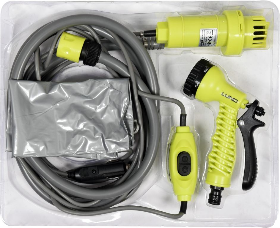 Přenosná sprcha vybavená elektrickým čerpadlem. Užitečné pro kemping a na jiných místech bez přístupu ke koupelně, ale i k mytí vozidla apod.