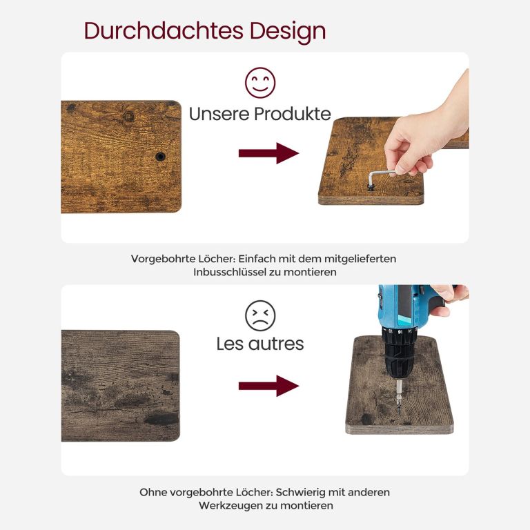 Montáž je snadná a rychlá díky předpřipraveným panelům a přehlednému návodu. Každá police unese až 5 kg a díky promyšlenému řešení s prostorem pro kabely bude vaše domácnost vždy působit uklizeně. Kvalitní dřevotříska a ocel zaručují dlouhou životnost a snadnou údržbu.