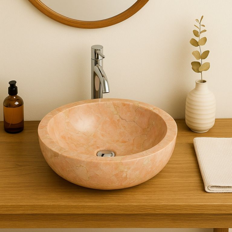 Designové umyvadlo Gemma je vyrobené z jednoho masivního bloku mramoru Marble Yellow, bez lepení a tmelů. Každý kus prochází pečlivým ručním opracováním, aby byly stěny o tloušťce cca 3 cm perfektně hladké zevnitř a zároveň pevné a stabilní. Průměr 45 cm a výška 17 cm nabízí komfortní prostor pro každodenní používání, odtok má standardní evropskou velikost. Protože jde o přírodní kámen, může se dodané umyvadlo mírně lišit odstínem, kresbou i rozměry – právě to zaručuje, že žádné dvě umyvadla nejsou stejné. Umyvadlo je určeno na desku a není mrazuvzdorné.