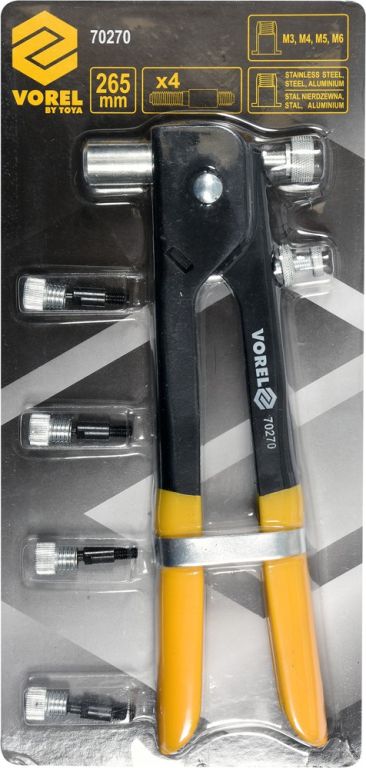 Ruční nýtovačka pro nýtovací matice M3-M6 od firmy Vorel 70270. Vyrobeno z odolné nástrojové oceli. Povrch s práškovým nástřikem. Navrženo pro práci s nýtovacími maticemi z nerezové oceli, oceli a hliníku. Ergonomický tvar rukojeti zajišťuje pohodlnou práci.