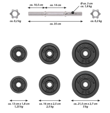 Set obsahuje jednu 35 cm činkovou tyč s průměrem nástavců 30 mm, hmotnost tyče cca 1,8 kg, dva šroubovací uzávěry, dvě kotouče po 5 kg, dvě po 2,5 kg a dva po 1,25 kg – dohromady 20 kg zátěže. Díky variabilitě závaží je ideální pro rozšiřující trénink, od posilování paží až po komplexní posilování celého těla.