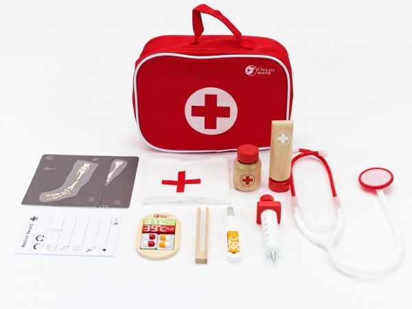 Vše, co potřebuje doktor najedete v tomto setu. Stačí si vzít stetoskop (plastový) a můžete začít léčit. V sadě je spousta dřevěných doplňků, aby hra byla zajímavější a dokážete tak vyléčit každou bolístku.
