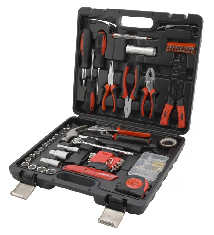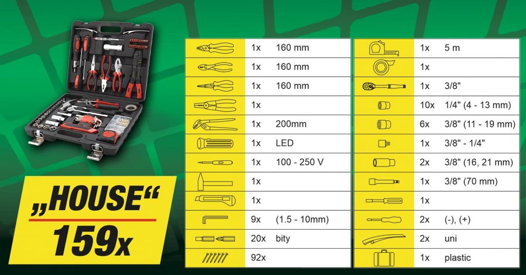 Tento praktický kufřík obsahuje vše potřebné na malé opravy a úpravy v domácnosti. Sada obsahuje ergonomické šroubováky, imbusové klíče, žiletkový nůž, nejběžnější typy kleští včetně elektrikářských, kladivo, 3/8" ráčnu s nástavci, LED svítilnu, šroubovák na bity včetně 20 ks bitů, svinovací metr o délce 5 m, izolační pásku a další. Mimojiné je sada opatřena pouzdrem s 92 ks spojovacího materiálu. Veškeré příslušenství je přehledně uspořádáno v plastovém přenosném kufříku.
