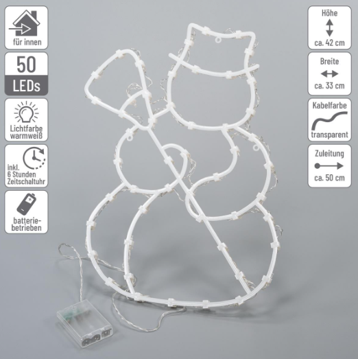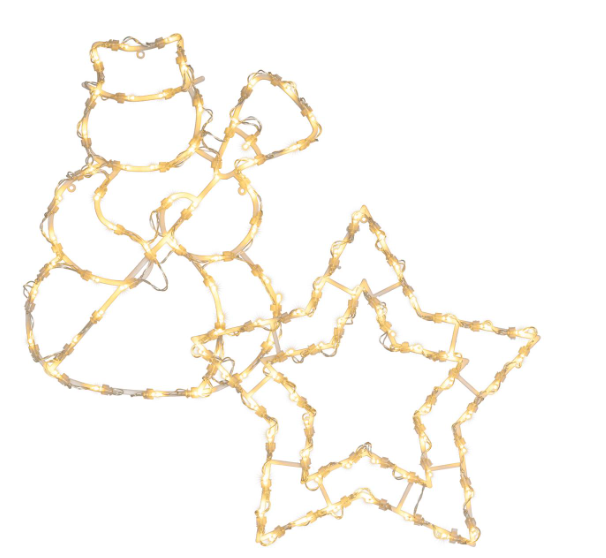 Dekorativní sada 2 okenních obrázků sestávající ze sněhuláka a hvězdy, každý s 35 teplými bílými diodami, 60 cm přívodní vedení s průhledným kabelem.