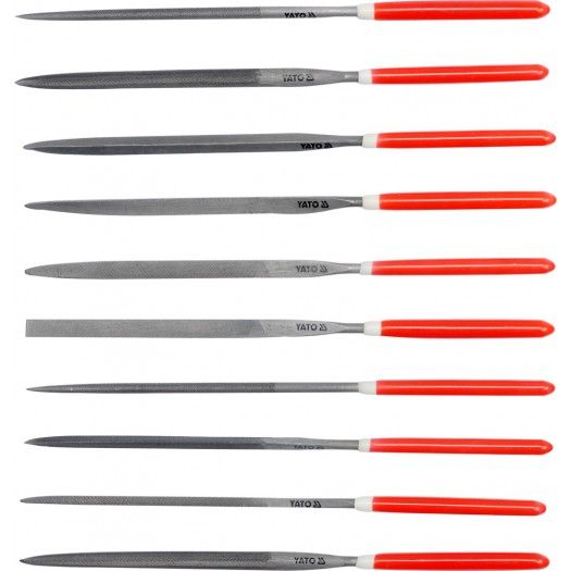 V sadě je plochý, kruhový, trojúhelníkový, nožový, oválný a další tvary pilníků.