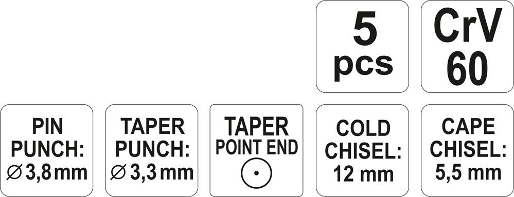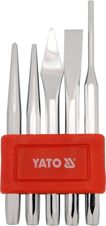 Sada 5ks sekáčů a vyražečů v plastovém držáku. Obashuje: křížový sekáč 5,5 x 130 mm YT-4694; plochý sekáč 12 x 130 mm YT-4693, kuželový vyrážeč 3,3 x 120 mm YT-4691; vyražeč 3,8 x 150 mm YT-4690 a špičatý důlčík délky 120 mm YT-4692.