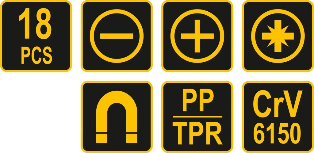 Šroubováky jsou vyrobeny z kvalitní CrV oceli, která zaručuje dlouhou životnost a odolnost proti opotřebení. Protiskluzné rukojeti z PP a TPR umožňují bezpečnou manipulaci. Sada je přehledně uspořádána ve stojanu, což usnadňuje skladování i rychlý výběr správného nástroje.