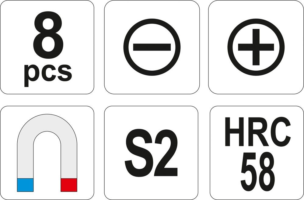 Vyrobeno z nerezové oceli S2 tvrzené na HRC 58. Hrot šroubováků je kalený a pískovaný, což zabezpečuje jejich dlouhodobou pevnost a životnost.