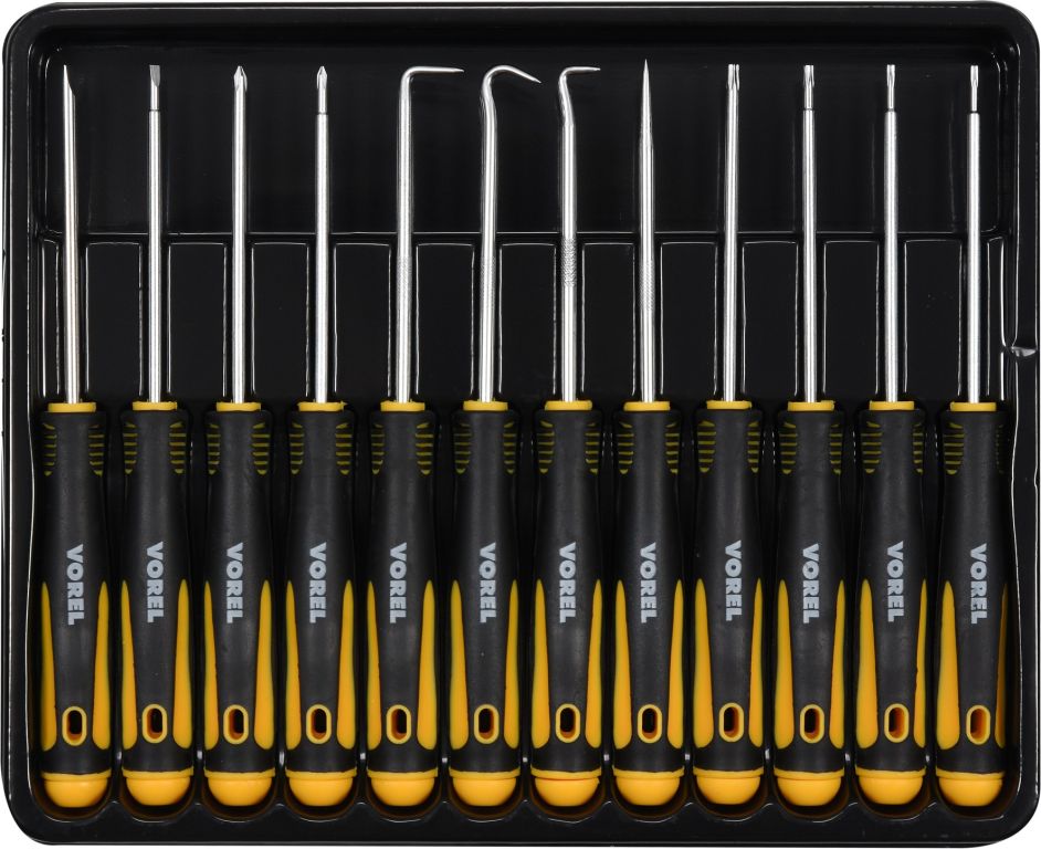 Sada 12 ks šroubováků a háků určených pro jemnou mechaniku a demontáž drobných součástí zařízení.