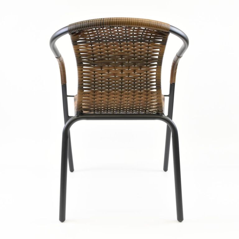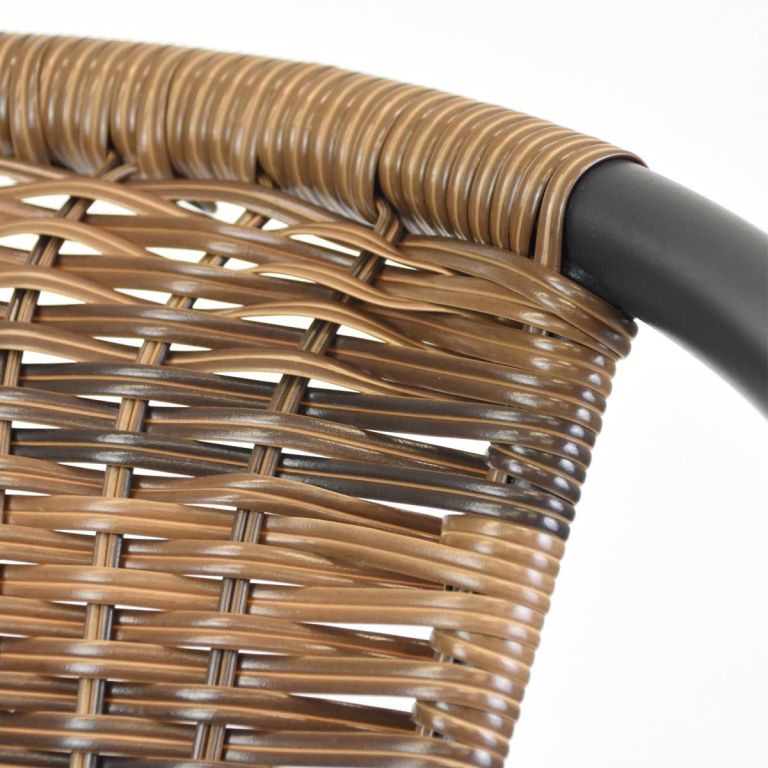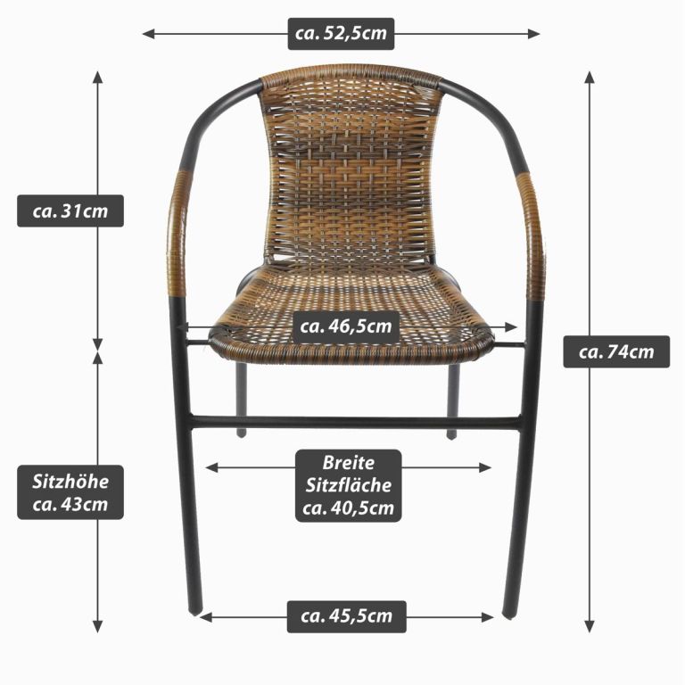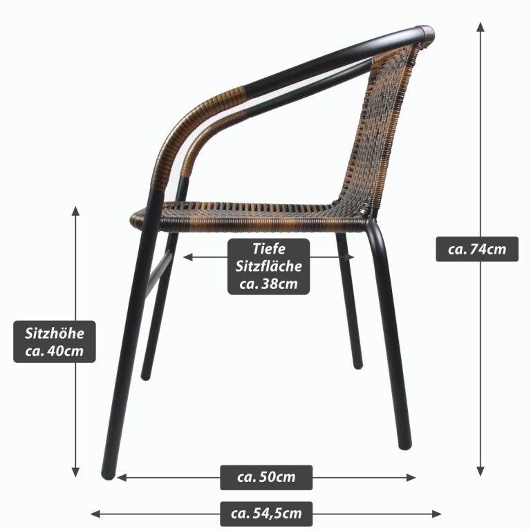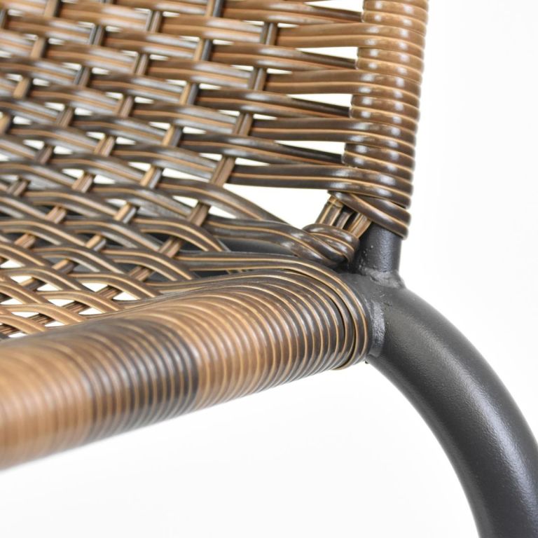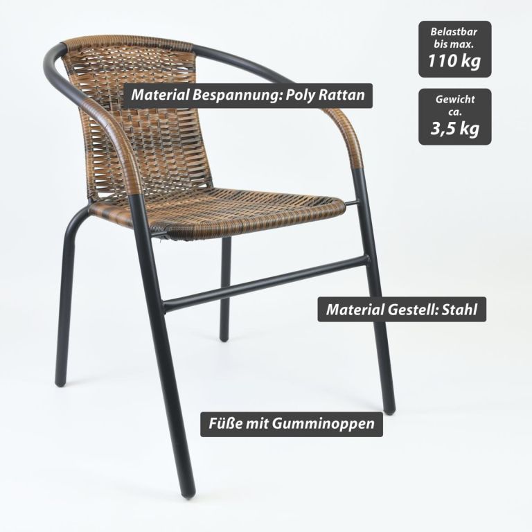 Bistro židle pro pravou středomořskou atmosféru ve stylu francouzských kaváren a bister je lehkým a vkusným kouskem k posezení. Několik židlí tohoto typu můžete naskládat na sebe a ušetřit tak spoustu místa, pokud chcete židli odložit a uložit ji na zimní měsíce. Použité materiály u této židle jsou nenáročné na údržbu, odolné vlivu počasí a nevyžadují speciální prostředky na ošetření. Lehká a přesto robustní stohovatelná židle s komfortní ratanovou sedací plochou je velmi pohodlná. Ocelová konstrukce je ošetřená práškovým povrchem a nohy mají gumové krytky, které zabraňují uklouznutí, tlumí hluk při pohybu a chrání podlahu. Polyrattan je vyroben z plastu, je odolný proti roztržení a zajímavě tkaný. Zkombinujte tyto stohovací židle s odpovídajícími malými kulatými bistro stolky dostupnými v našem obchodě. Tímto způsobem si můžete nakonfigurovat svůj vlastní bistro set.