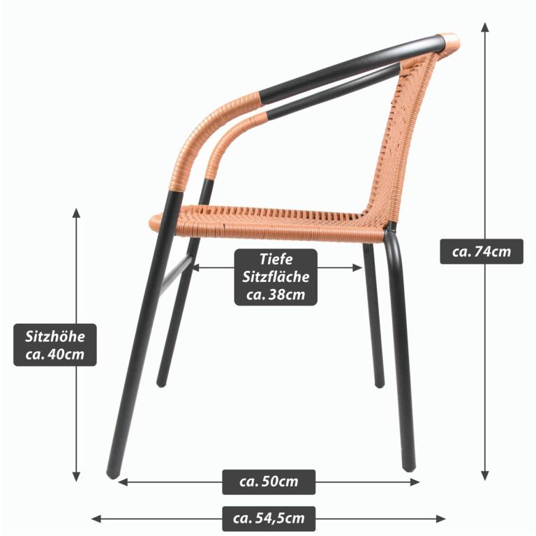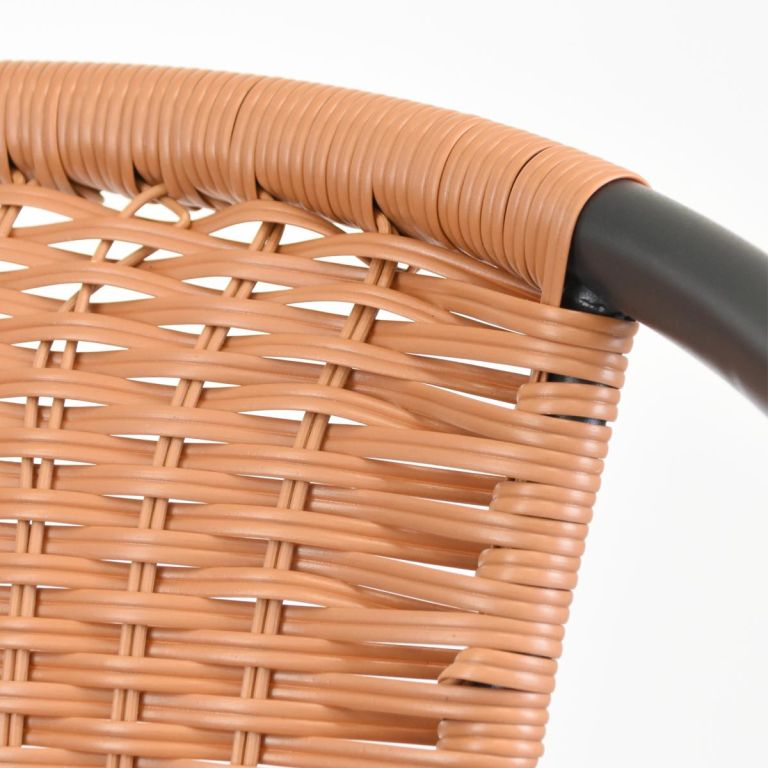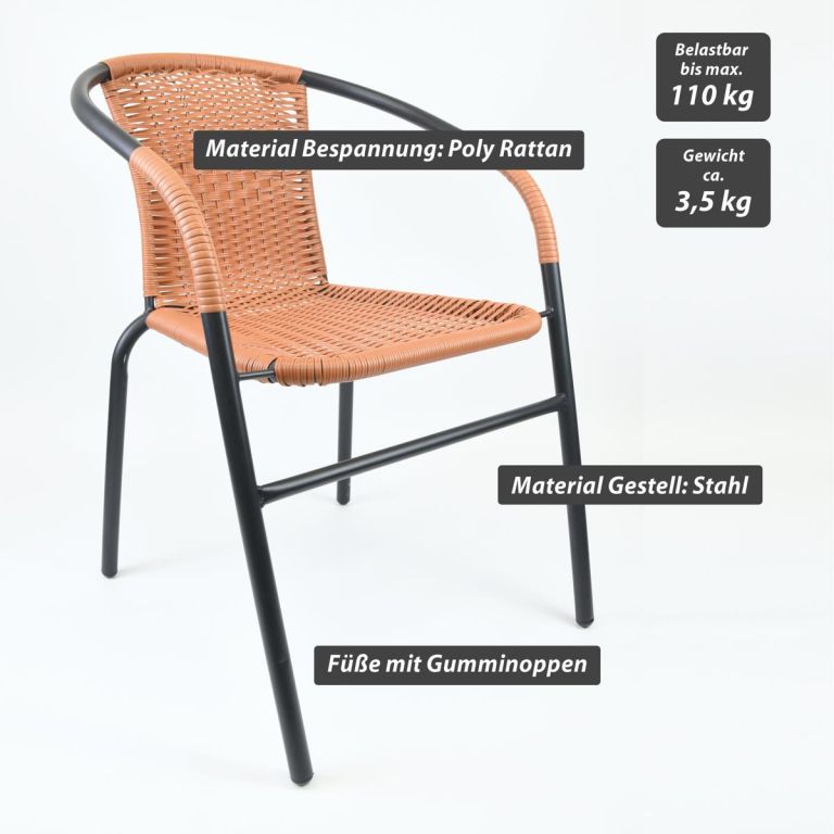 Bistro židle pro pravou středomořskou atmosféru ve stylu francouzských kaváren a bister je lehkým a vkusným kouskem k posezení. Několik židlí tohoto typu můžete naskládat na sebe a ušetřit tak spoustu místa, pokud chcete židli odložit a uložit ji na zimní měsíce. Použité materiály u této židle jsou nenáročné na údržbu, odolné vlivu počasí a nevyžadují speciální prostředky na ošetření. Lehká a přesto robustní stohovatelná židle s komfortní ratanovou sedací plochou je velmi pohodlná. Ocelová konstrukce je ošetřená práškovým povrchem a nohy mají gumové krytky, které zabraňují uklouznutí, tlumí hluk při pohybu a chrání podlahu. Polyrattan je vyroben z plastu, je odolný proti roztržení a zajímavě tkaný. Zkombinujte tyto stohovací židle s odpovídajícími malými kulatými bistro stolky dostupnými v našem obchodě. Tímto způsobem si můžete nakonfigurovat svůj vlastní bistro set.