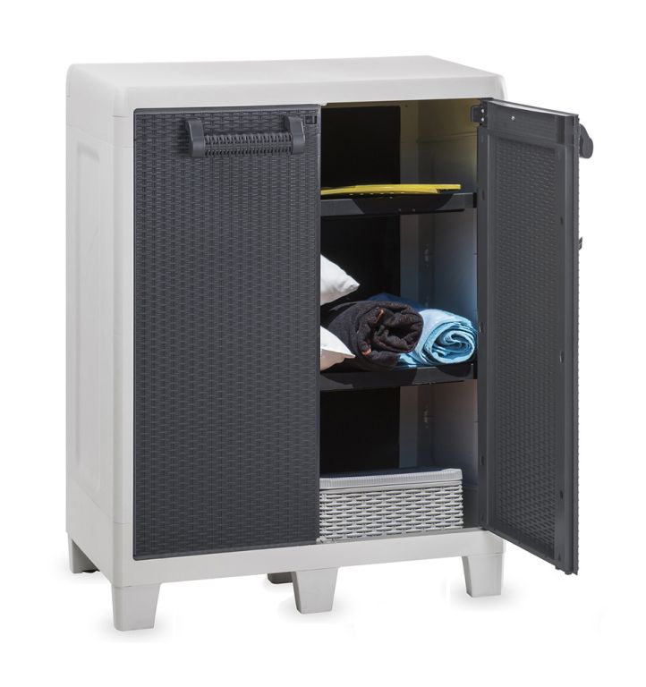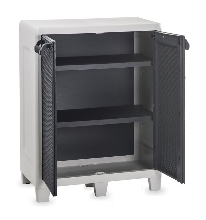 Představujeme Vám revoluční řešení pro uskladnění Vašich zahradních potřeb. Tato dvoudvéřová plastová skříňka zaujme svým elegantním designem. Barevné provedení grafitové a světle šedé barvy přináší do Vaší zahrady moderní a stylový prvek.