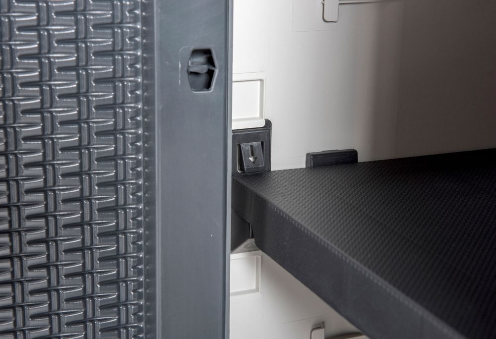 NASTAVITELNÉ POLICE: Dvě nastavitelné police s maximální nosností až 30 kg nabízejí dostatek místa pro uspořádání Vašich nástrojů a příslušenství. Imitace ratanového povrchu zajišťuje, že se skříňka přirozeně hodí do zeleného prostředí Vaší zahrady.