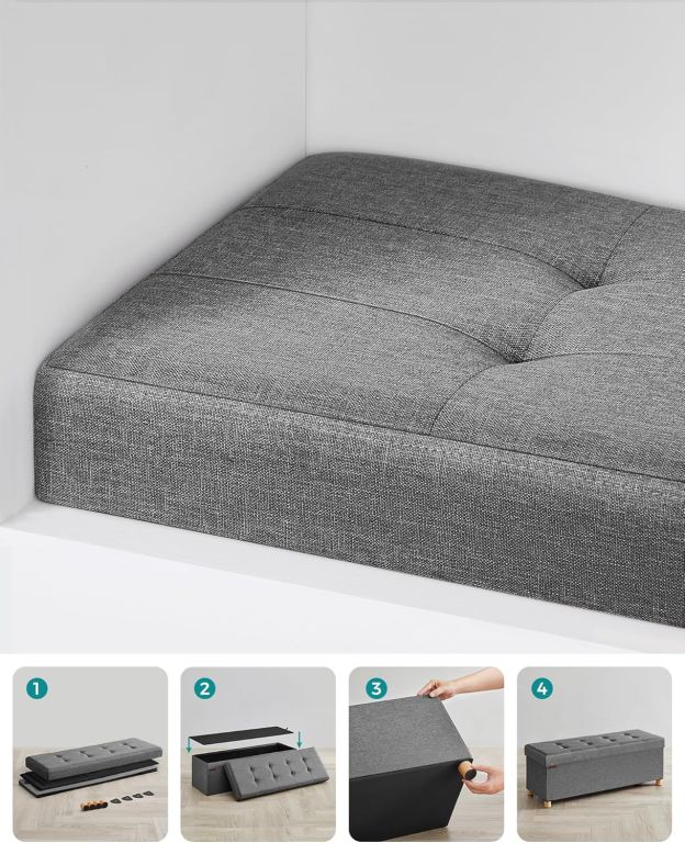 Robustní konstrukce z MDF desky a kovové výztuhy zajišťují vysokou nosnost až 300 kg. Povrch z lněné látky je příjemný na dotek a snadno se udržuje. Montáž je rychlá a jednoduchá, lavice je vybavena protiskluzovými nožkami pro stabilitu a ochranu podlahy.