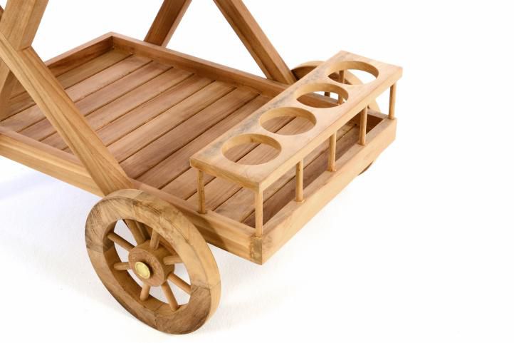 Použitý masivní teak je stabilní, odolný a především odolný proti povětrnostním vlivům. Přesto doporučujeme, abyste vozík nevystavovali trvale vlivům počasí. V opačném případě vytváří šedo-stříbřitou patinu, typickou pro teakové dřevo. Tento kus je dodáván v demontu. Montáž je přesto jednoduchá a velmi logicky strukturovaná.