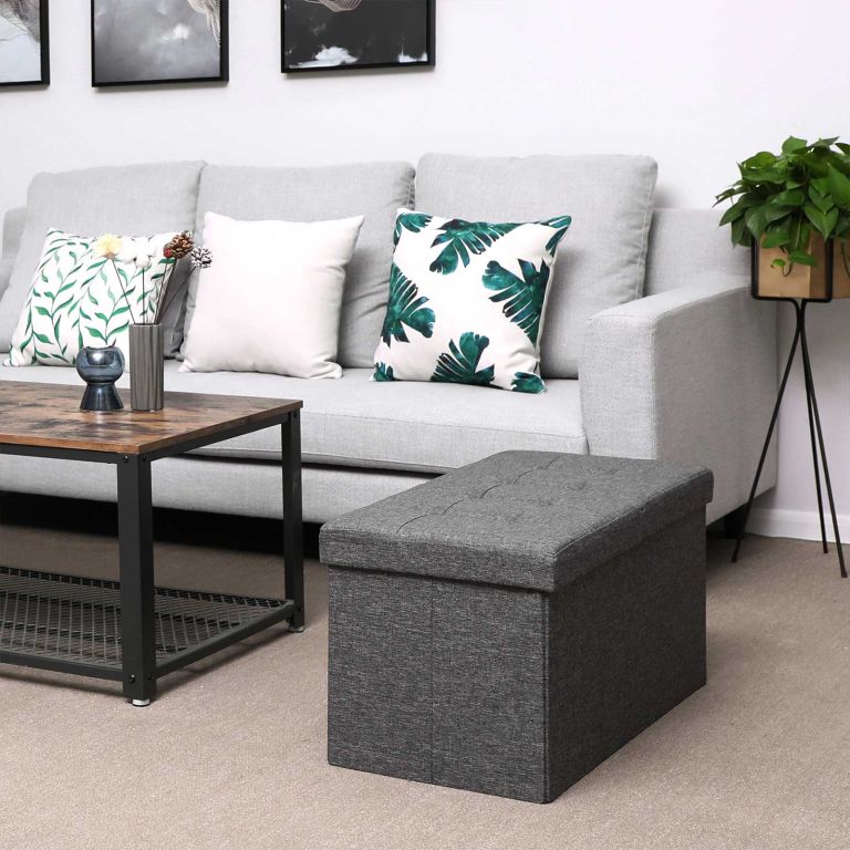 Stabilní konstrukce z MDF třídy E1 a certifikovaná nosnost 300 kg z ní dělají spolehlivou lavici pro dva. Lněný potah v tmavě šedé barvě je příjemný na dotek a snadno ladí s interiérem. Sestavení zabere minutu – tři díly, jasný návod, hotovo bez nářadí.