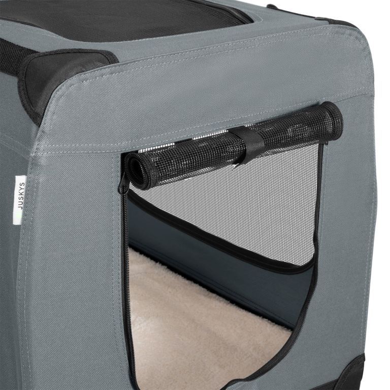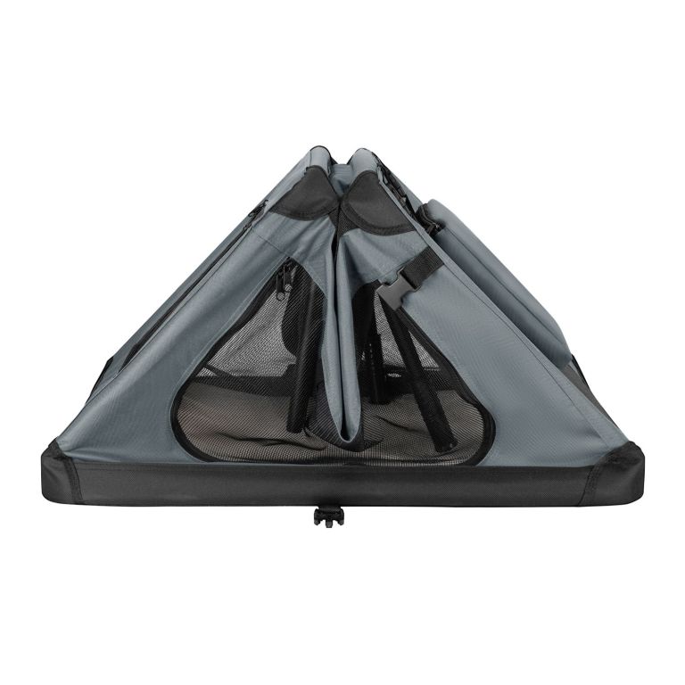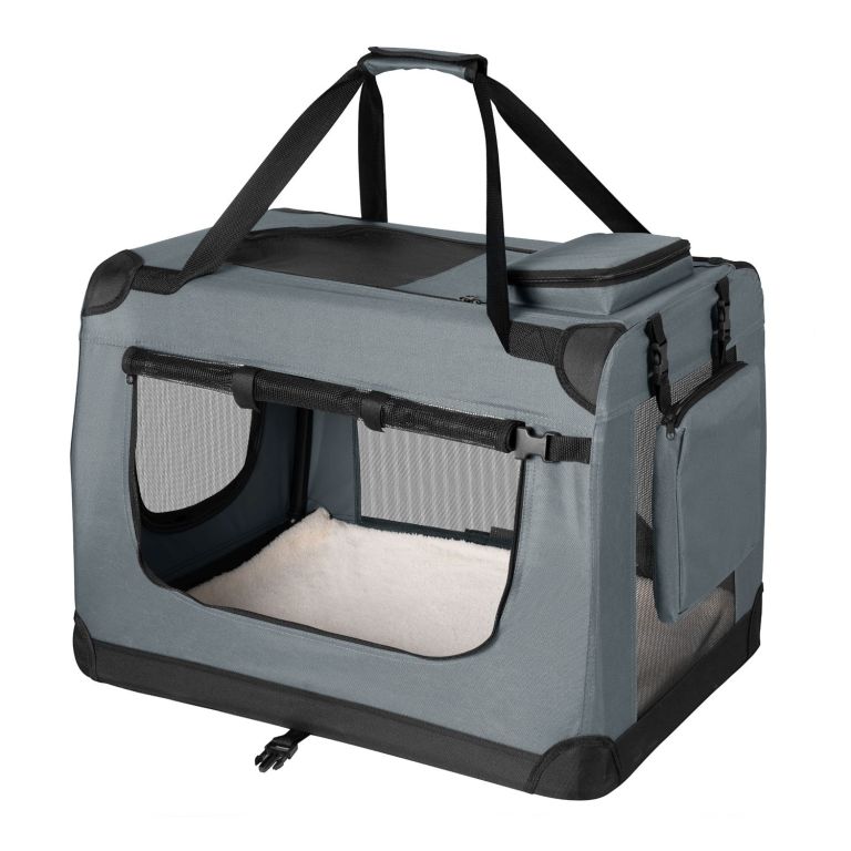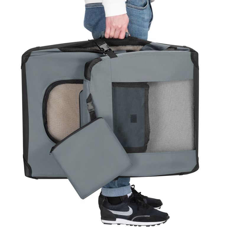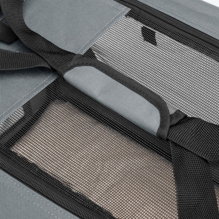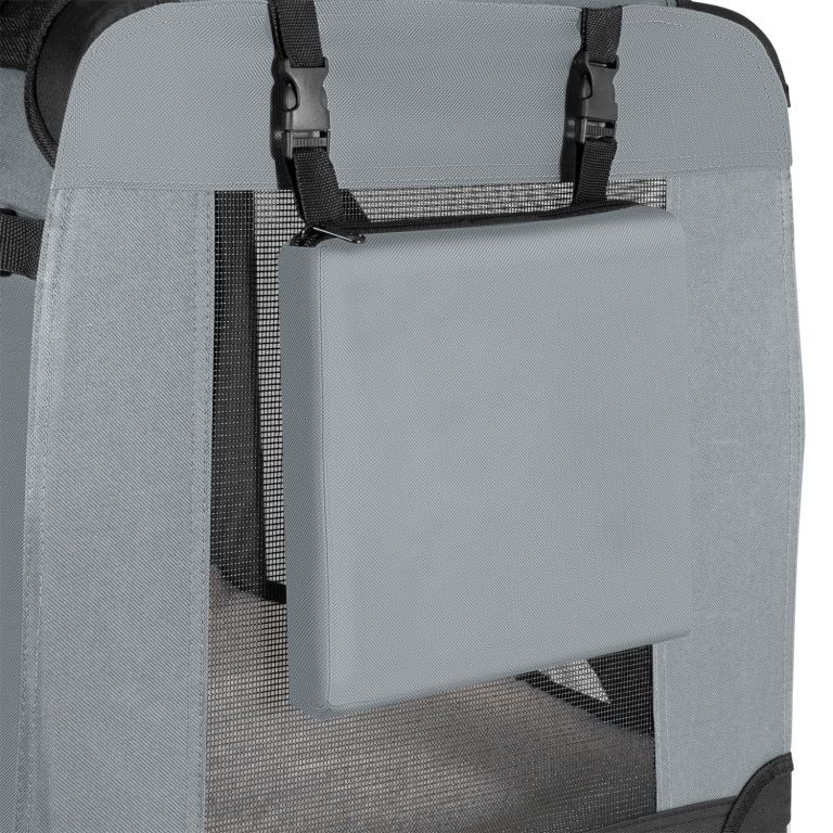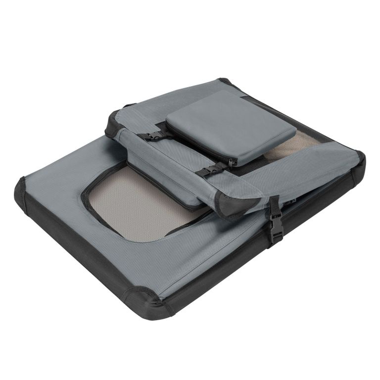 Přepravka je ideální na cesty autem – snadno ji upevníte pomocí pásu na zadní sedačku nebo do kufru. Praktická kapsa na vrchní straně pojme vodítko, pamlsky nebo hračku. Skládací konstrukce umožňuje rychlé složení i rozložení bez použití nářadí, a ve složeném stavu nezabere téměř žádné místo.