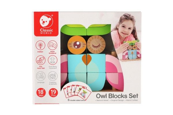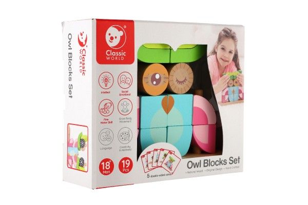 Skládanka sova obsahuje 19 dřevěných dílků (14 kostek, podložka, 4 tyčky), které lze různě stavět na podložku s tyčkami.