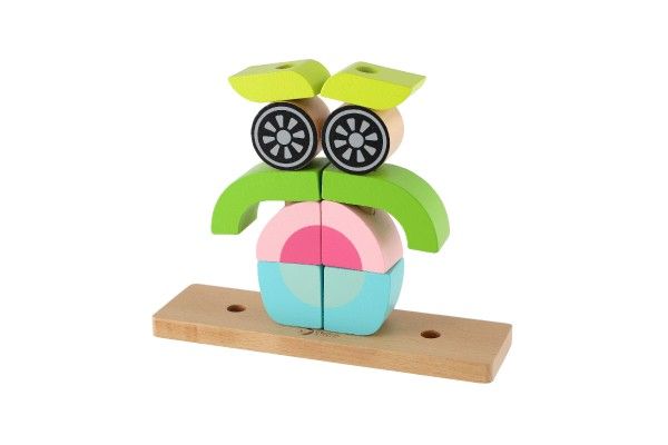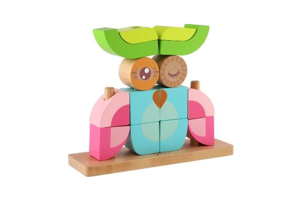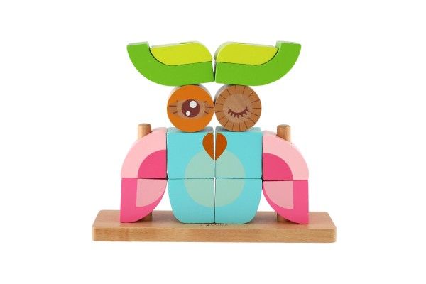 Skládanka sova obsahuje 19 dřevěných dílků (14 kostek, podložka, 4 tyčky), které lze různě stavět na podložku s tyčkami. Děti si tak mohou postavit různé předměty i zvířata. V sadě najdete 5 oboustraných předloh pro skládání. Konkrétní barvu nebo druh výrobku není možné z technických důvodů zvolit, objednávce bude přidělena náhodná varianta dle skladových možností.