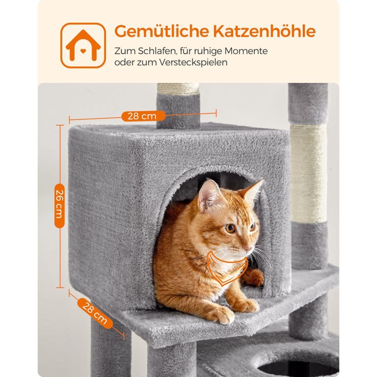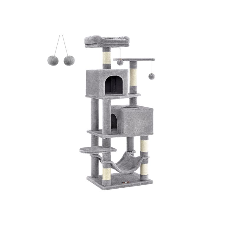 Dopřejte své kočce luxusní prostor pro hraní, škrábání i odpočinek. Toto vysoké škrabadlo v elegantní světle šedé barvě nabízí útulné pelíšky, závěsnou houpačku i zábavné míčky, které potěší každou kočku a zútulní váš domov.