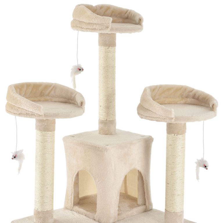 Součástí konstrukce jsou dvě plyšové budky pro nerušený odpočinek, tři pelíšky ve vyšších patrech pro výhled, sedm sisalových sloupků pro broušení drápků, dvě šikmé rampy a tři závěsné hračky ve tvaru myši. Konstrukce z MDF s měkkým plyšem je pevná, stabilní a zároveň příjemná na dotek.