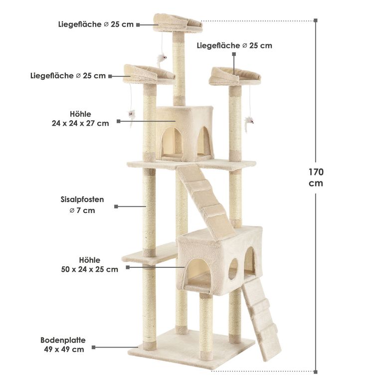 Škrabadlo pro kočky 170 cm s pelíšky, domečky a sloupky