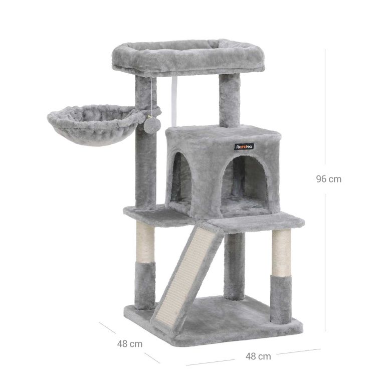 Škrabadlo s domečkem a pelíškem, světle šedé 48 x 48 x 96 cm