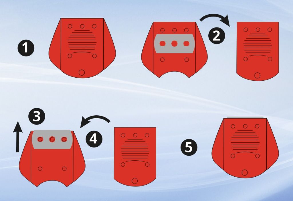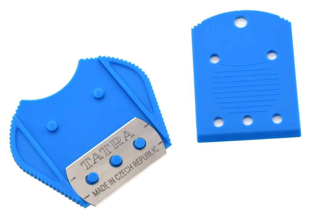 Škrabka je uvnitř osazena klasickou žiletkou české výroby, která snadno pronikne do vrstvy lepidla mezi sklo a nálepku. Žiletku lze po použití zasunout dovnitř, takže škrabku je možné snadno uschovat bez rizika zranění o ostrý břit.
