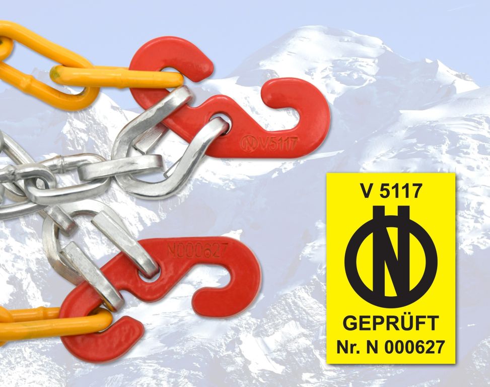 Sněhové řetězy se zesílenými oky, pro osobní vozidla do hmotnosti 2200 kg, splňující evropské normy včetně v Rakousku vyžadované "ÖNORM V 5117".